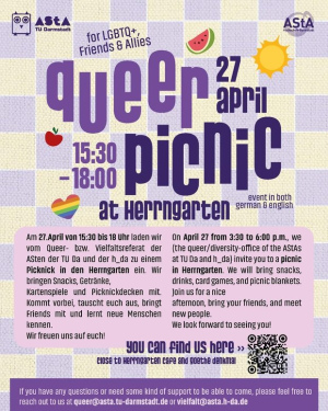 Am 27. April von 15:30 bis 18 Uhr laden wir vom Queer- bzw. Vielfaltsreferat der ASten der TU Da und der h_da euch zu einem Picknick in den Herrengarten ein. Wir bringen Snacks, Getränke, Kartenspiele und Picknickdecken mit und treffen uns in der Nähe von Herrengartencafé und Goethedenkmal (der QR-Code bringt euch zum genauen Treffpunkt).